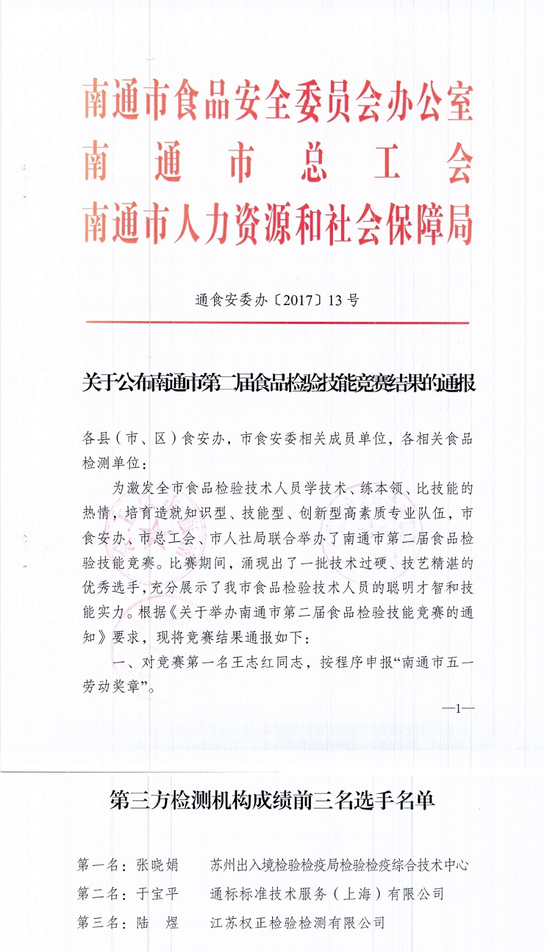 南通市第二屆食品檢驗(yàn)技能競(jìng)賽我公司檢驗(yàn)人員喜獲佳績(jī)